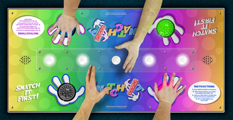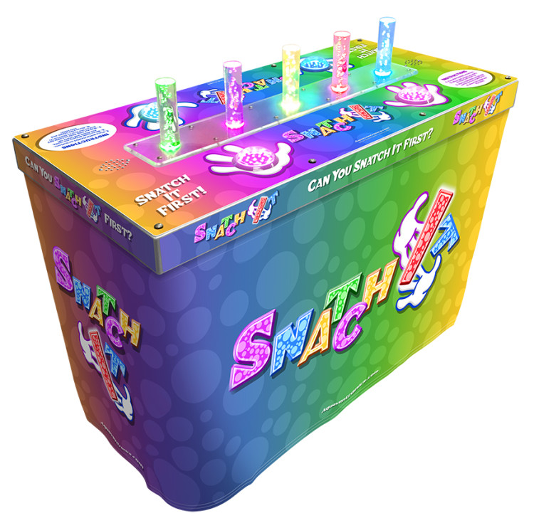 Snatch It is a tabletop electronic game designed for fast-paced party play and rentals — a compact, colorful unit with multiple light-up buttons that test players’ speed and reflexes as they race to “snatch” the lit targets first. Table-top height, bright printed wraparound graphics, and clear labeled pads make setup and play intuitive. Ideal for corporate team-building, school events, or carnival-style aisles, Snatch It provides high-energy, short-round gameplay that draws a crowd, encourages friendly competition, and reliably resets between rounds for back-to-back use.